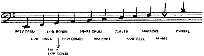 BASS DRUM SNARE DRUM RIM SHOT HI-HAT CYMBAL MARACAS CLAVES HIGH BONGO LOW BONGO LOW CONGA |