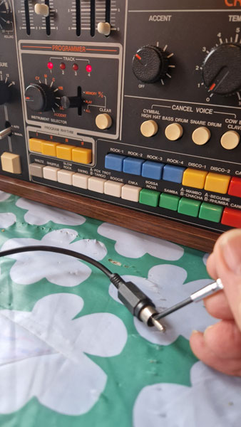 | When you're done, switch to PLAY and turn the tempo knob to one of its lowest setting. - you can mute a programmed instrument, by selecting the instrument with the INSTRUMENT SELECTOR, - you can add another instrument live by switching to that instrument and bridgeing the connector, - the ADD VOICE part is preprogrammed, you can slide the volume up and down for extra spice, - add another preset by holding the button of your your programmed rhythm and another preset button at the same time. |