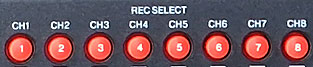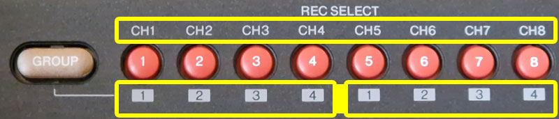 LOWER ROW - GRP select: input kanaal wordt toegekend aan GROUP 1, 2, 3 of 4 en de GROUP wordt opgenomen op één van de vast toegekende opnamesporen.